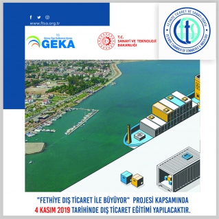 GEKA 2019 yılı Teknik Destek Programı kapsamında “Fethiye Dış Ticaret ile Büyüyor” projesi için destek almaya hak kazanan FTSO, hibeye ilişkin protokol gereğince, Fethiye ve Seydikemer’deki üye işletmeleri başta olmak üzere bölge genelinde ihracat hedefi olan, ihracat potansiyeli olan ve halihazırda ihracat yapan firmalara ücretsiz eğitim ve danışmanlık faaliyetleri düzenleyecek. Bu kapsamda Fethiye Ticaret ve Sanayi Odası Hizmet Binası Likya Salonu’nda 4 Kasım 2019 Pazartesi günü dış ticaret yapan firmalara mevcut kapasitelerini artırabilmeleri ve yeni pazarlara ulaşmalarını sağlamak, ihracat yapma potansiyeli olan firmalara da ihracat yol haritası oluşturabilmeleri amacıyla 1 günlük ücretsiz eğitim verilecek.