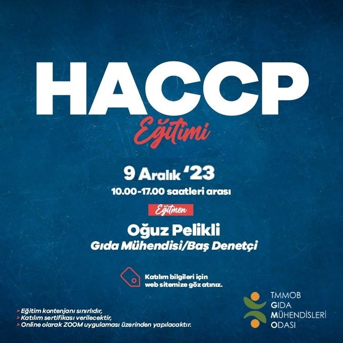 Gıda zincirinde bulunan herhangi bir kuruluşta HACCP kurulması, uygulanması ve sistemin sürekli geliştirilebilmesi için gerekli olan temel bilgiyi aktarma amaçlı 9 Aralık 2023 Cumartesi günü TMMOB Gıda Mühendisleri Odası Baş Denetçisi Gıda Mühendisi Oğuz Pelikli tarafından çevrim içi HACCP eğitimi düzenlenecektir. Eğitim kontenjanı sınırlıdır.