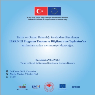 Tarım ve Orman Bakanlığı Tarım Reformu Genel Müdürlüğü tarafından, IPARD III Programının Tanıtımı ile yatırımcıların ve potansiyel faydalanıcıların söz konusu program hakkında bilgilendirilmesi amacıyla, 26 Kasım 2025 Çarşamba günü, Muğla İli Menteşe İlçesi Yücelen Otel'de saat 14:00'te toplantı gerçekleştirilecektir. Tarımsal Kalkınmayı Destekleme Kurumu (TKDK) Kurum Başkanı Sayın Dr. Ahmet ANTALYALI’nın teşrif edeceği IPARD III Tanıtım Toplantısına tüm girişimciler ve yatırımcılar davetlidir.