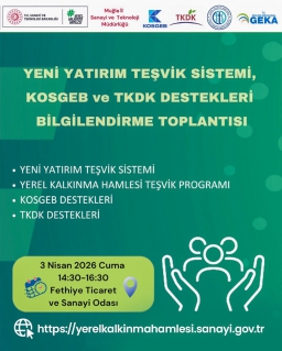 Güney Ege Kalkınma Ajansı Koordinatörlüğü ve Odamız işbirliğinde, Muğla İl Sanayi ve Teknoloji Müdürü, KOSGEB Muğla İl Müdürü ve TKDK Muğla İl İrtibat Ofisi ile ilgili kurumların katılımlarıyla, yeni yatırım teşvikleri ve destek mekanizmalarına ilişkin bilgilendirme toplantısı düzenlenecektir.