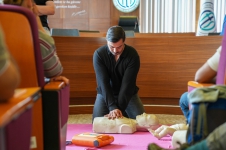 Eğitimde teorik bilgilerin yanı sıra uygulamalı çalışmalarla katılımcılar ilk yardım becerilerini geliştirme fırsatı buldu ve ilk yardım müdahalelerini birebir deneyimledi.